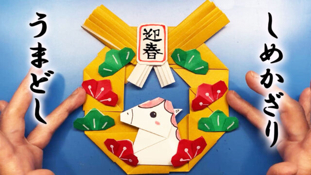 おりがみ 【お正月折り紙】午年のしめ飾り・リースの作り方 2025年12月22日 pojie mama life blog こんにちは。 今回は折り紙で 午年のしめ飾りをつくります。 作品の説明 リースの土台、馬、松、梅をそれぞれ作って組み合わせて完成 …