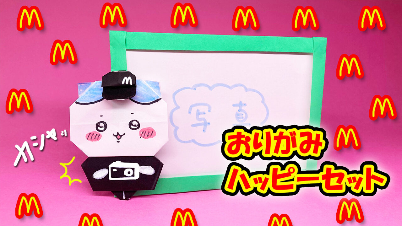 フォトフレーム、マックの帽子をかぶってカメラを持ったハチワレを